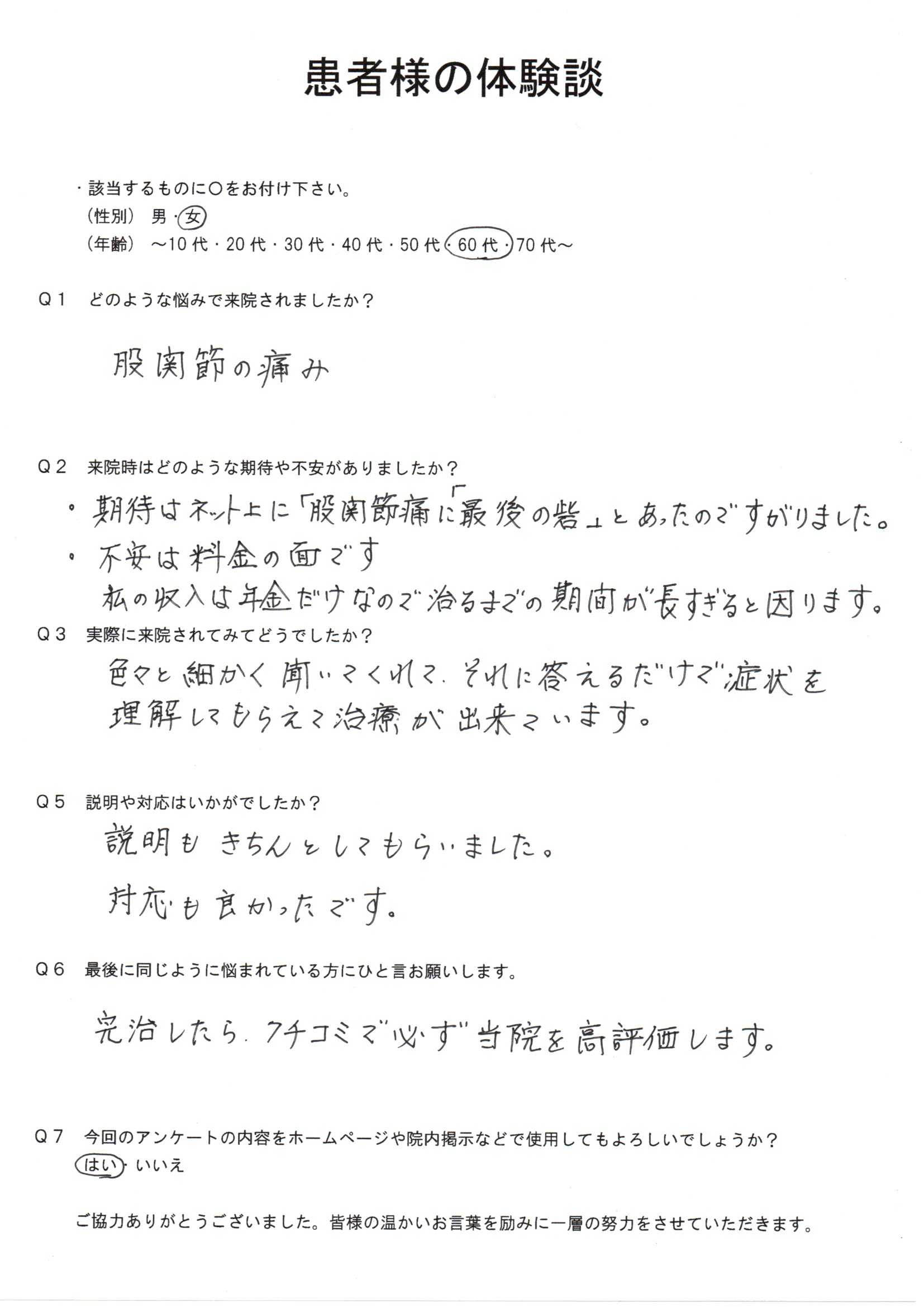 期待は、ネット上に、股関節痛に「最後の砦」とあったので、すがりました。