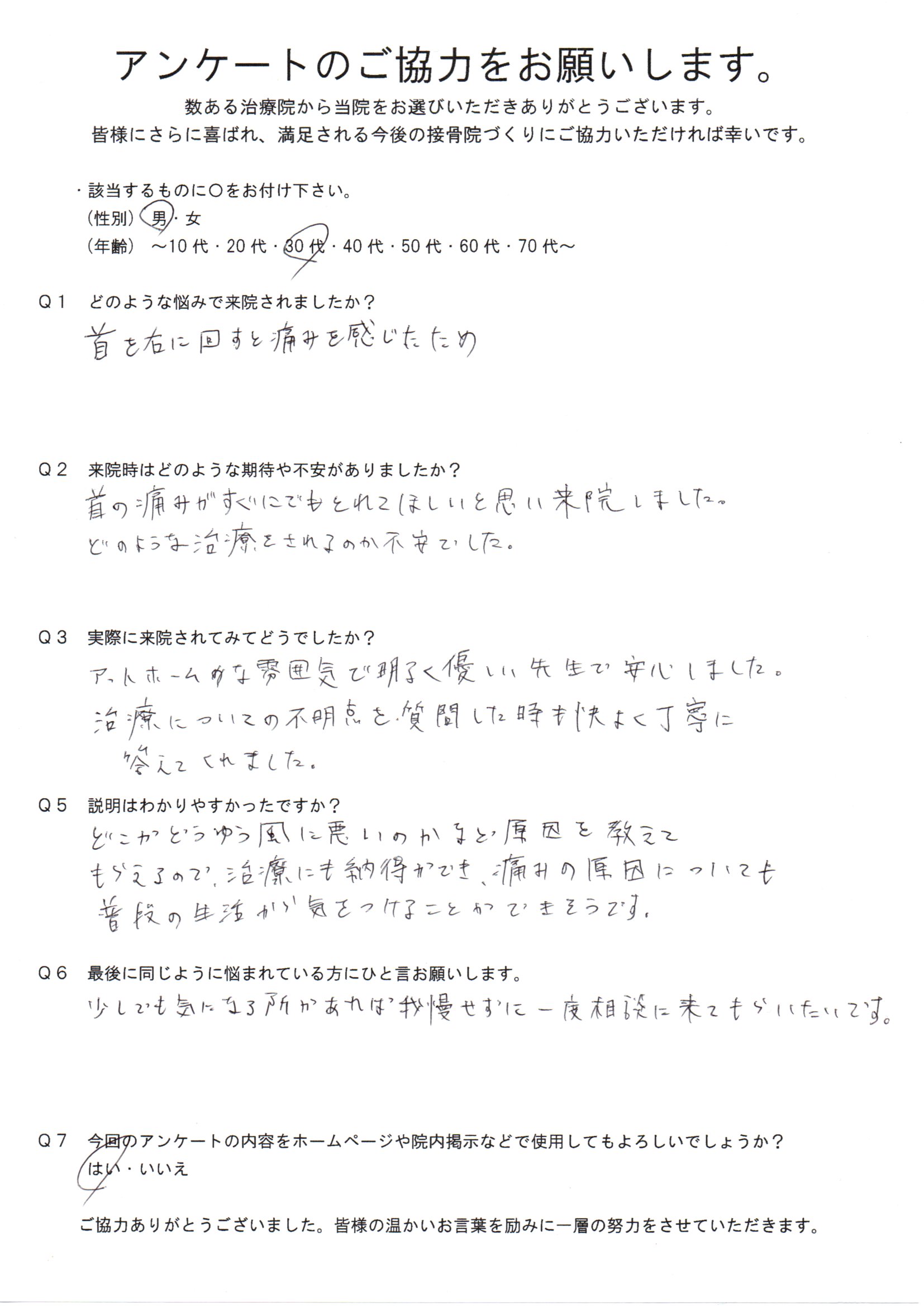 首の痛みがすぐにでも取れてほしいと思い、来院しました。