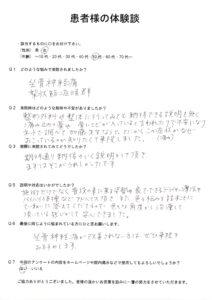 男性・60代 Q1 どのような悩みで来院されましたか? 坐骨神経痛・ぎっくり腰(通院中に発症) 整形外科に行っても痛みが解消しなかったこと。 Q2 来院時はどのような期待や不安がありましたか? 果たして治癒 […]