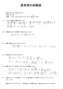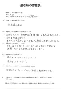 女性・60代 Q1 どのような悩みで来院されましたか? 股関節の痛み Q2 来院時はどのような期待や不安がありましたか? 期待は、ネット上に、股関節痛に「最後の砦」とあったので、すがりました。 […]